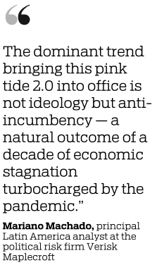 Mariano Machado, principal Latin America analyst at the political risk firm Verisk Maplecroft, told CNBC: "The dominant trend bringing this pink tide 2.0 into office is not ideology but anti-incumbency — a natural outcome of a decade of economic stagnation turbocharged by the pandemic."