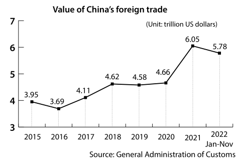 Even though China's export growth rate slowed in November due to a variety of factors such as softening overseas demand and geopolitical tensions, market watchers have expressed optimism over prospects for the country's trade sector in 2023, believing that its industrial upgrading and moves to optimize COVID-19 prevention measures will further facilitate domestic manufacturers to expand their market channels abroad, as well as help boost global economic recovery.
