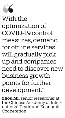 Zhou Mi, a senior researcher at the Chinese Academy of International Trade and Economic Cooperation, said innovation was key to driving China's services sector development. "Online services saw rapid growth, though the pandemic dealt a blow to the consumer market. With the optimization of COVID-19 control measures, demand for offline services will gradually pick up and companies need to discover new business growth points for further development."