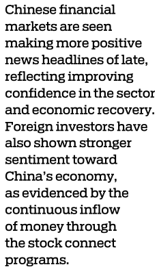 Chinese financial markets are seen making more positive news headlines of late, reflecting improving confidence in the sector and economic recovery. Foreign investors have also shown stronger sentiment toward China's economy, as evidenced by the continuous inflow of money through the stock connect programs.