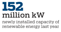 Newly installed capacity of renewable energy reached 152 million kW last year, or 76.2 percent of the country's total newly added installed energy capacity, including 37.63 million kW of wind power, 87.41 million kW of solar power and 3.34 million kW of biomass power generation, said Wang Dapeng, an official with the National Energy Administration, during a news briefing held in Beijing on Monday.
