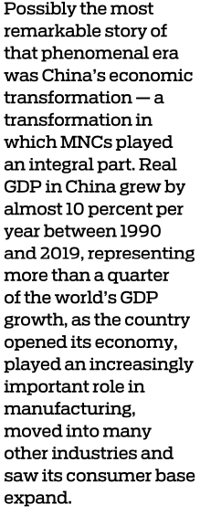 The past 30 years have been a time of rapid globalization, an era in which multinational companies (MNCs) tapped global capital, built businesses optimized for global supply and demand, and served customers worldwide. Possibly the most remarkable story of that phenomenal era was China's economic transformation — a transformation in which MNCs played an integral part. Real GDP in China grew by almost 10 percent per year between 1990 and 2019, representing more than a quarter of the world's GDP growth, as the country opened its economy, played an increasingly important role in manufacturing, moved into many other industries and saw its consumer base expand. MNCs flocked to China during the period, accounting for more than half of the country's exports at one point and helping bring best practices to China from around the world.