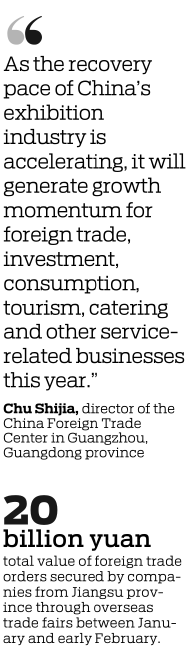 "As the recovery pace of China's exhibition industry is accelerating, it will generate growth momentum for foreign trade, investment, consumption, tourism, catering and other service-related businesses this year," said Chu Shijia, director of the China Foreign Trade Center in Guangzhou, capital of Guangdong province.