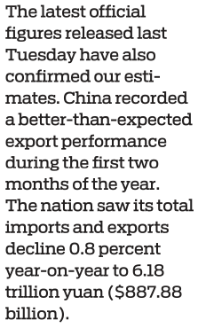 The latest official figures released last Tuesday have also confirmed our estimates. China recorded a better-than-expected export performance during the first two months of the year. The nation saw its total imports and exports decline 0.8 percent year-on-year to 6.18 trillion yuan ($887.88 billion).Exports increased 0.9 percent from a year earlier to 3.5 trillion yuan while imports declined 2.9 percent to 2.68 trillion yuan during the period, resulting in a trade surplus of 810.32 billion yuan, which expanded 16.2 percent on a yearly basis, the General Administration of Customs said.