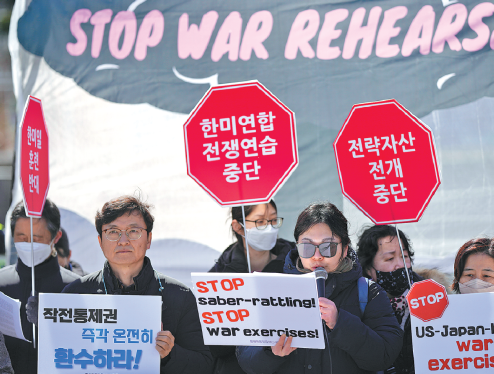 Calling for the suspension of the ROK-US joint military exercise, Minjung Action, a nongovernmental organization, said on March 13 that what lies behind the drills is the hegemony strategy of the US to instigate a war on the Korean Peninsula and form a military alliance among the ROK, the US and Japan.