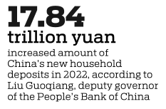 In 2022, China's new household deposits soared by 17.84 trillion yuan ($2.6 trillion), 7.94 trillion yuan more than in the previous year, Liu Guoqiang, deputy governor of the People's Bank of China, the central bank, said at a news conference earlier this month.