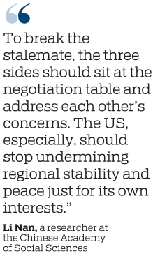 "To break the stalemate, the three sides should sit at the negotiation table and address each other's concerns. The US, especially, should stop undermining regional stability and peace just for its own interests."
