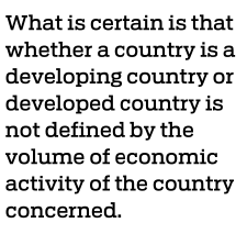 There is no generally recognized criteria to determine whether a country is developing or developed. What is certain is that whether a country is a developing country or developed country is not defined by the volume of economic activity of the country concerned. Should this be a standard, India should already have been determined to be a developed country. There are some 30 countries that are widely recognized or self-designated as developed countries — some are small in terms of population, like Switzerland, whose total economic volume is far below that of Nigeria, a recognized developing country. Nevertheless, many small countries are self-designated as developed countries as their per capita GDP is often far higher than that of Nigeria.