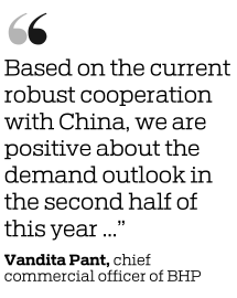Demand for copper, nickel and potash is expected to increase significantly to support the megatrends of decarbonization and electrification in China, which will be providing massive opportunities for global mining companies like BHP, said Vandita Pant, chief commercial officer of BHP.