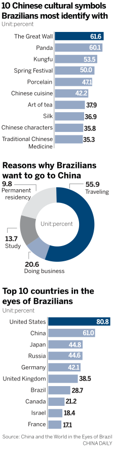 In tourism, Brazilians have a strong interest in China, as 55.9 percent of the respondents want to visit China and more than 20 percent said they are willing to do business in China, according to the poll.