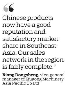 "Chinese products now have a good reputation and satisfactory market share in Southeast Asia. Our sales network in the region is fairly complete," said Xiang Dongsheng, vice-general manager of Liugong Machinery Asia Pacific Co Ltd, who added that the company has accelerated the pace of international business development by taking advantage of Guangxi's geographical location and its close cooperation with countries of the Association of Southeast Asian Nations.