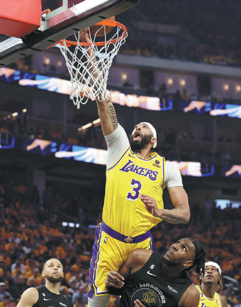 James' 3-pointer with 5:23 left in the third put the Lakers ahead by 10,86-76. Then Thompson's snazzy behind-the-back pass led to a dunk by Gary Payton II over James with 3:48 to go as Golden State cut it to 86-80 and forced a Lakers timeout.