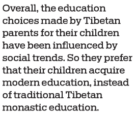 Overall, the education choices made by Tibetan parents for their children have been influenced by social trends. So they prefer that their children acquire modern education, instead of traditional Tibetan monastic education.