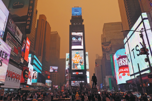 The Big Apple became "the Big Orange" by midday Wednesday as the sky over the nation's largest city plunged into a deep hazy orange. Streets in Manhattan resembled what they were like during the COVID-19 pandemic as residents and commuters again wore masks and heeded warnings from health officials about the impact of fine particles known as PM2.5, which can lead to respiratory illnesses.