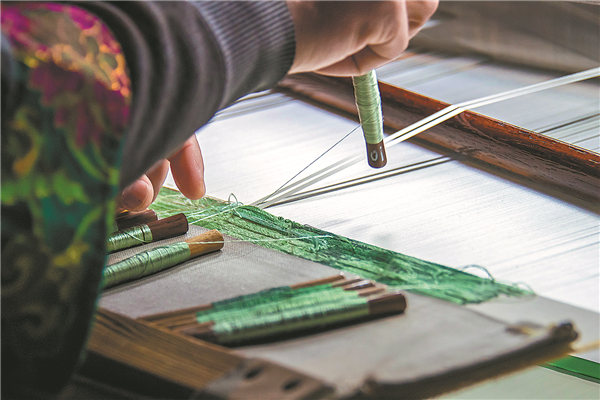 During production, weavers pass a shuttle over and under the alternating warps. [Photo provided to China Daily]