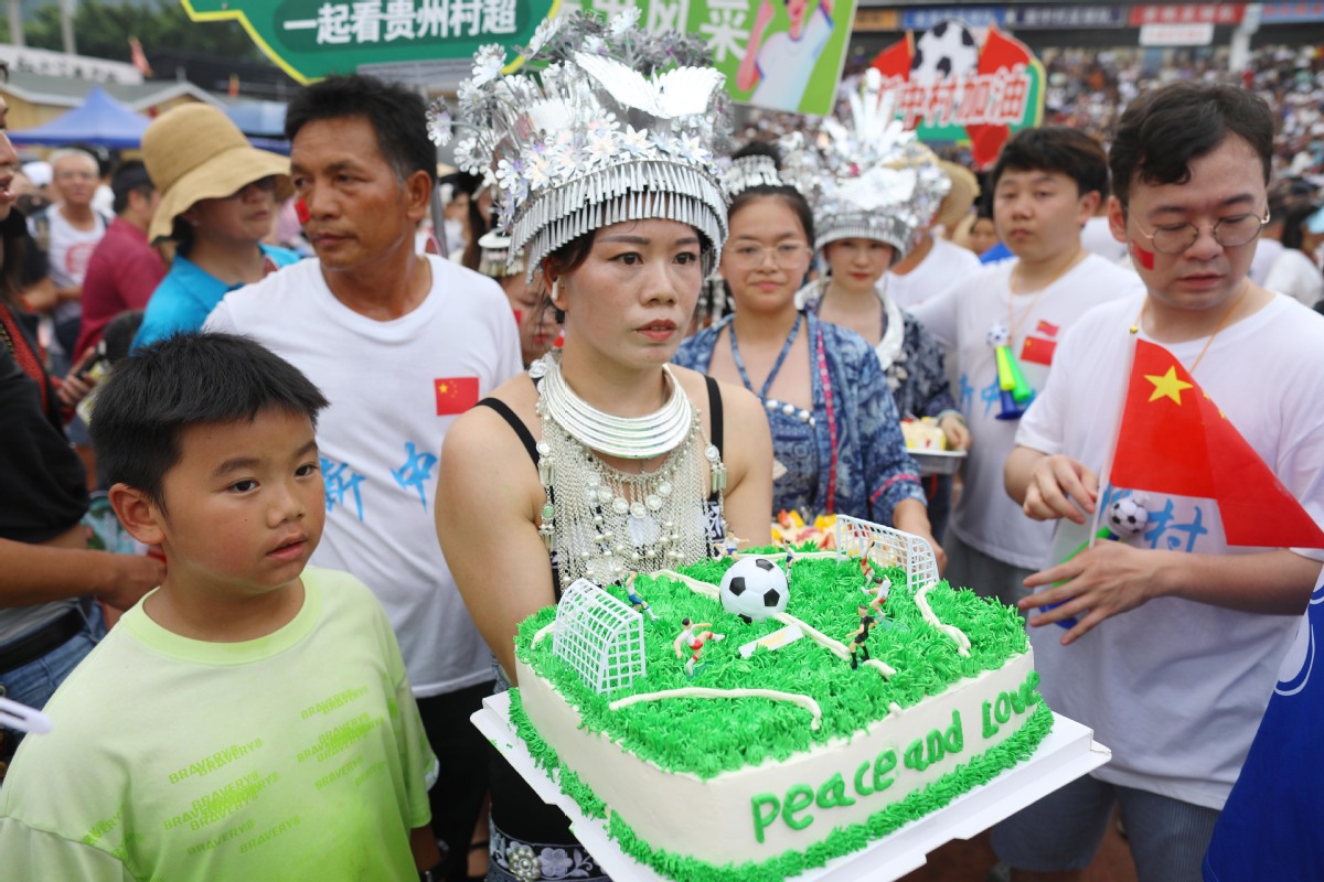 A spectator in local traditional ethnic costume holding a cake is seen during the final game of the "Village Super League" in Rongjiang county of Southwest China's Guizhou province July 29, 2023. [Photo by Zhu Xingxin/chinadaily.com.cn]