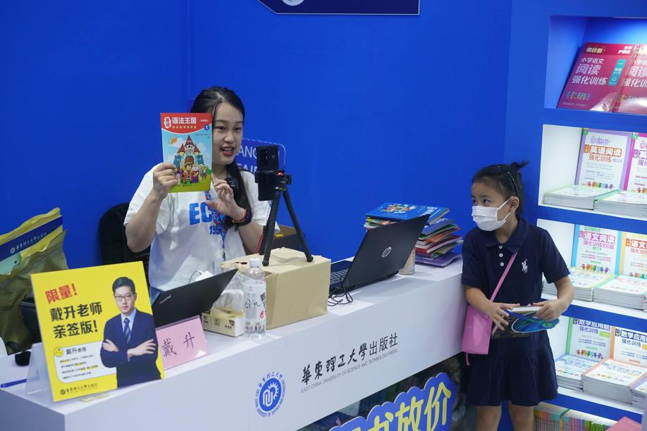 An editor from East China University of Science and Technology Press shows a reference book during a livestreaming service, which has been popular among parents who can’t attend in person. [Photo by Gao Erqiang / chinadaily.com.cn]