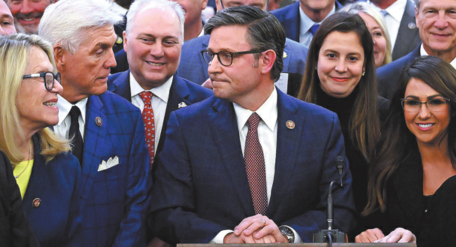 Mike Johnson (center) looks toward colleagues after being nominated Republican speaker of the US House of Representatives at Capitol Hill in Washington, DC, on Tuesday. SAUL LOEB/AGENCE FRANCE-PRESSE