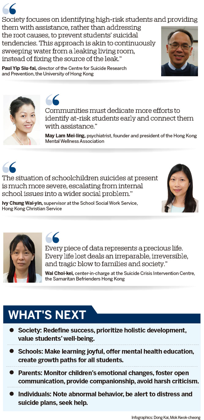 HKU's Yip suggests we go beyond identifying high-risk students and providing them with assistance. Society should address the root causes of youth anguish to prevent students' suicidal tendencies. "Our approach is akin to continuously sweeping water from a leaking living room instead of fixing the source of the leak," says Yip.