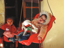 Now, Sawadi's daughters sing to Afraa, who is bundled up in winter clothes in their modest home.