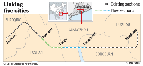 Starting from Panyu Station in Guangzhou, the capital of Guangdong, passengers can arrive in Foshan or Dongguan within 30 minutes, and can reach Zhaoqing or Huizhou in just one hour.