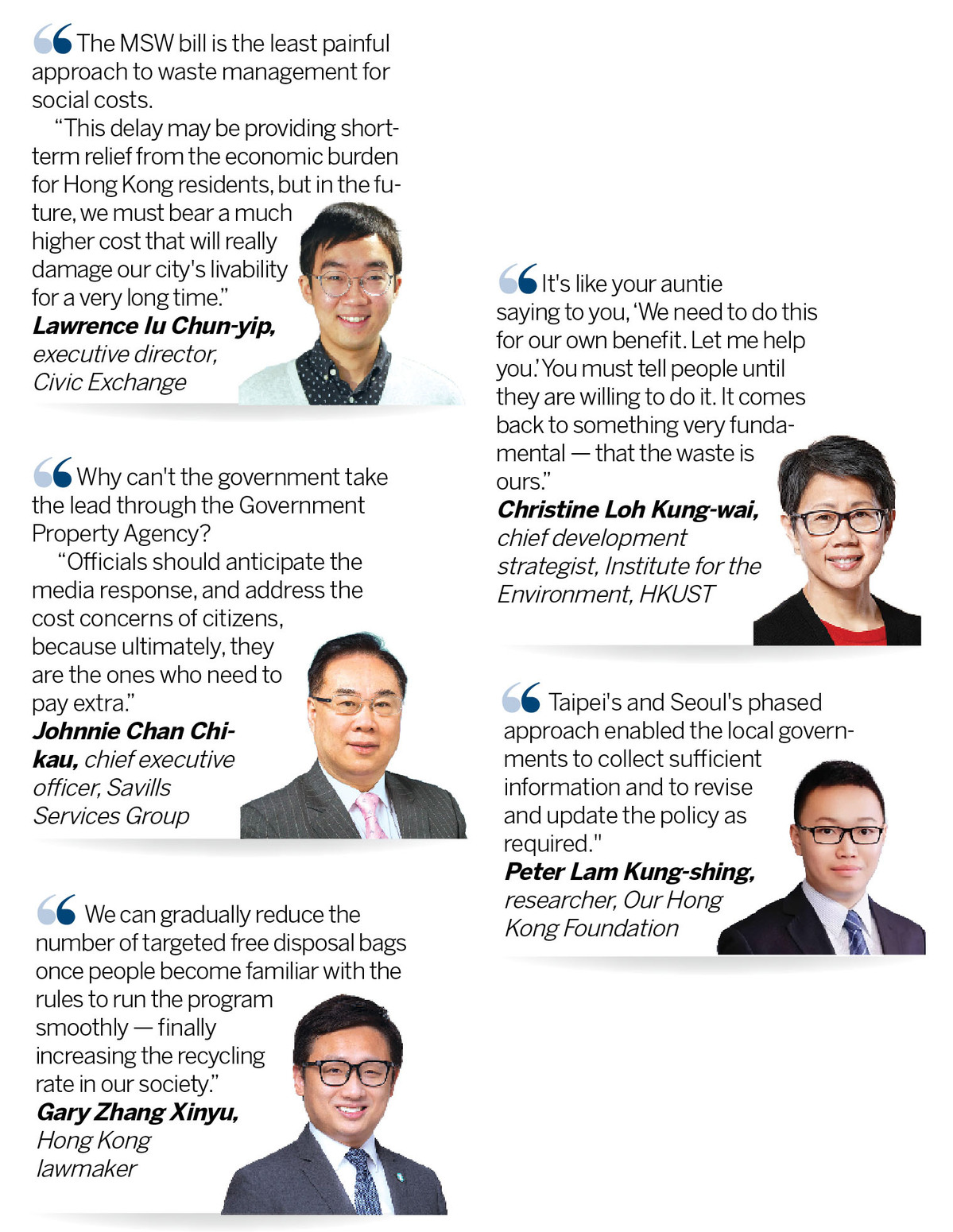 Savills Services Group's Chan, who is also immediate past president of the Hong Kong Association of Property Management Companies, said that government officials should think from the perspective of the public, and revise their top-down public relations strategy. "The officials should anticipate the media response, and address the concerns of citizens, because ultimately they are the ones who need to pay extra," said the property management veteran, who advised the government on the waste charging plan.
