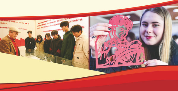 From left to right: Students at Shenyang Institute of Engineering take part in a Lei Feng-themed exhibition. International students at Shenyang University of Chemical Technology engage in a Lei Feng-themed paper-cutting activity. CHINA DAILY