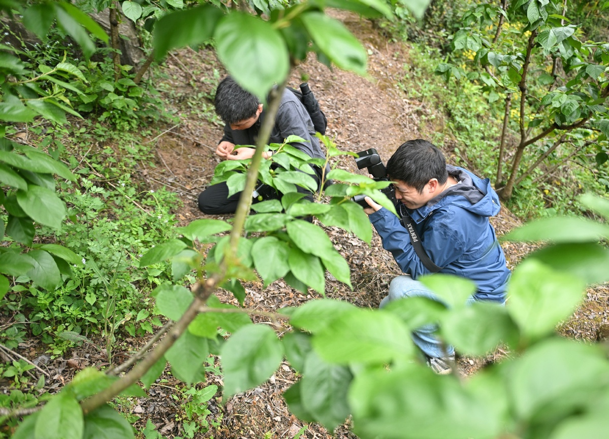 Hu Jun (R) and Luo Yao, researchers at the Chengdu Institute of Biology under Chinese Academy of Sciences, conduct a vegetation survey in the Longquan Mountains in Chengdu, Southwest China's Sichuan province, April 11, 2025. [Photo/Xinhua]