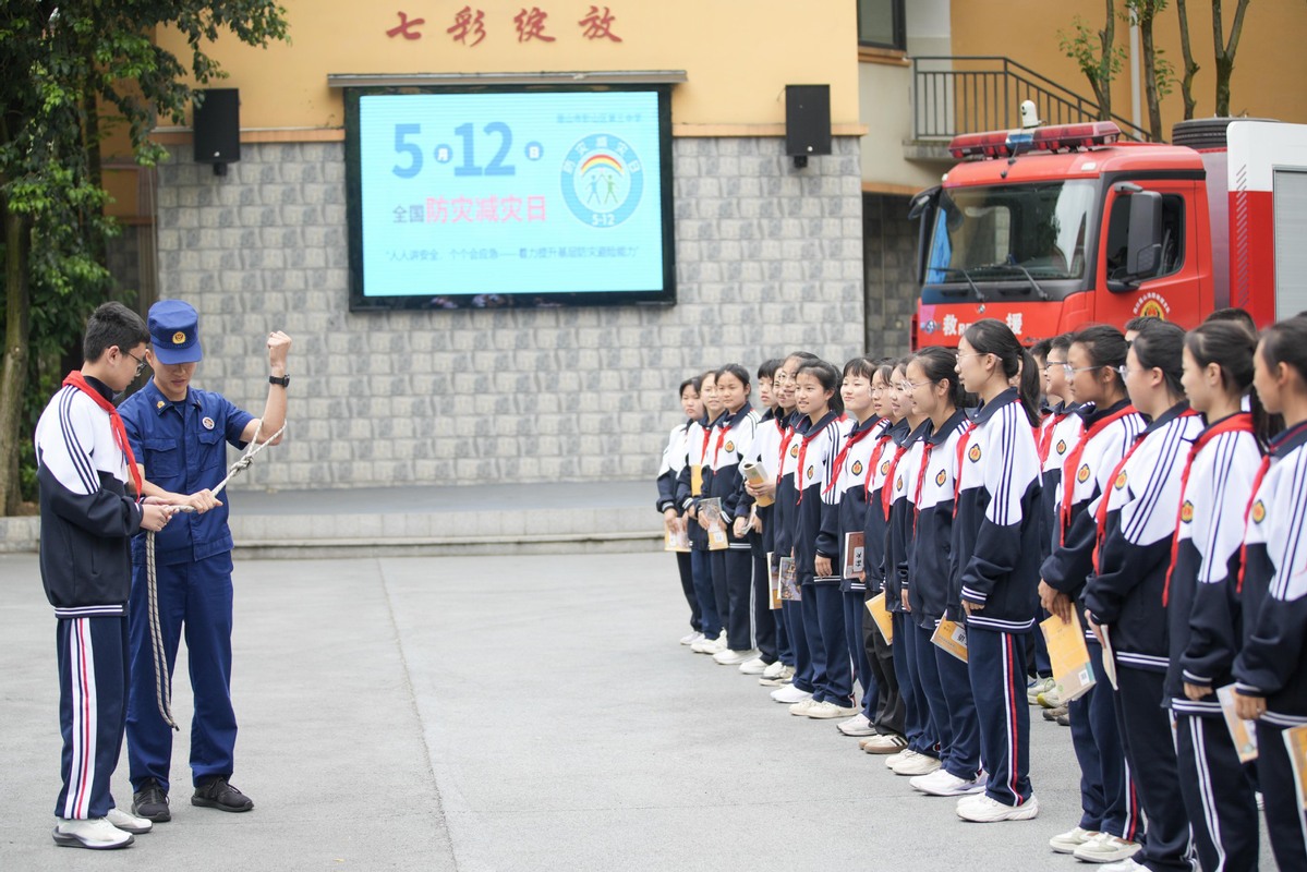 A firefighter introduces the use of escape ropes to students at a middle school in Pengshan district of Meishan city, Southwest China's Sichuan province, May 9, 2025. China observes the National Disaster Prevention and Reduction Day on May 12 each year. Various publicity, drill and training activities are carried out across China to improve public awareness in scientific disaster prevention and self-rescue. [Photo/Xinhua]