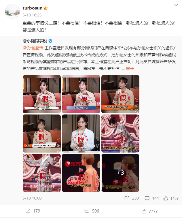 5月18日,演员邓超与孙俪通过微博发布联合声明,指出网络平台出现多支未经授权的AI伪造代言视频。