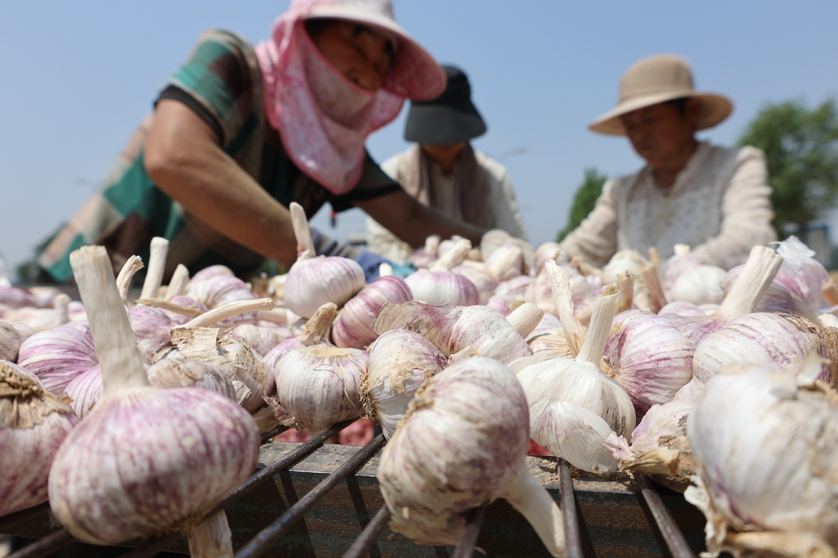 Farmers sorts and pack garlic in Kaifeng city, Central China's Henan province, May 21, 2025. The traditional Chinese solar term Xiaoman (Grain Buds) falls on May 21 this year, indicating that grain seeds are becoming full. [Photo/Xinhua]