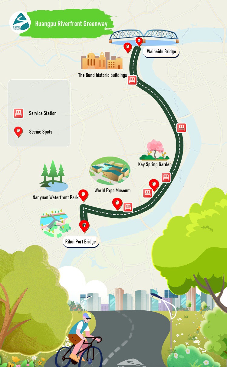 Route: From Waibaidu Bridge in the north to Rihui Port Bridge in the south