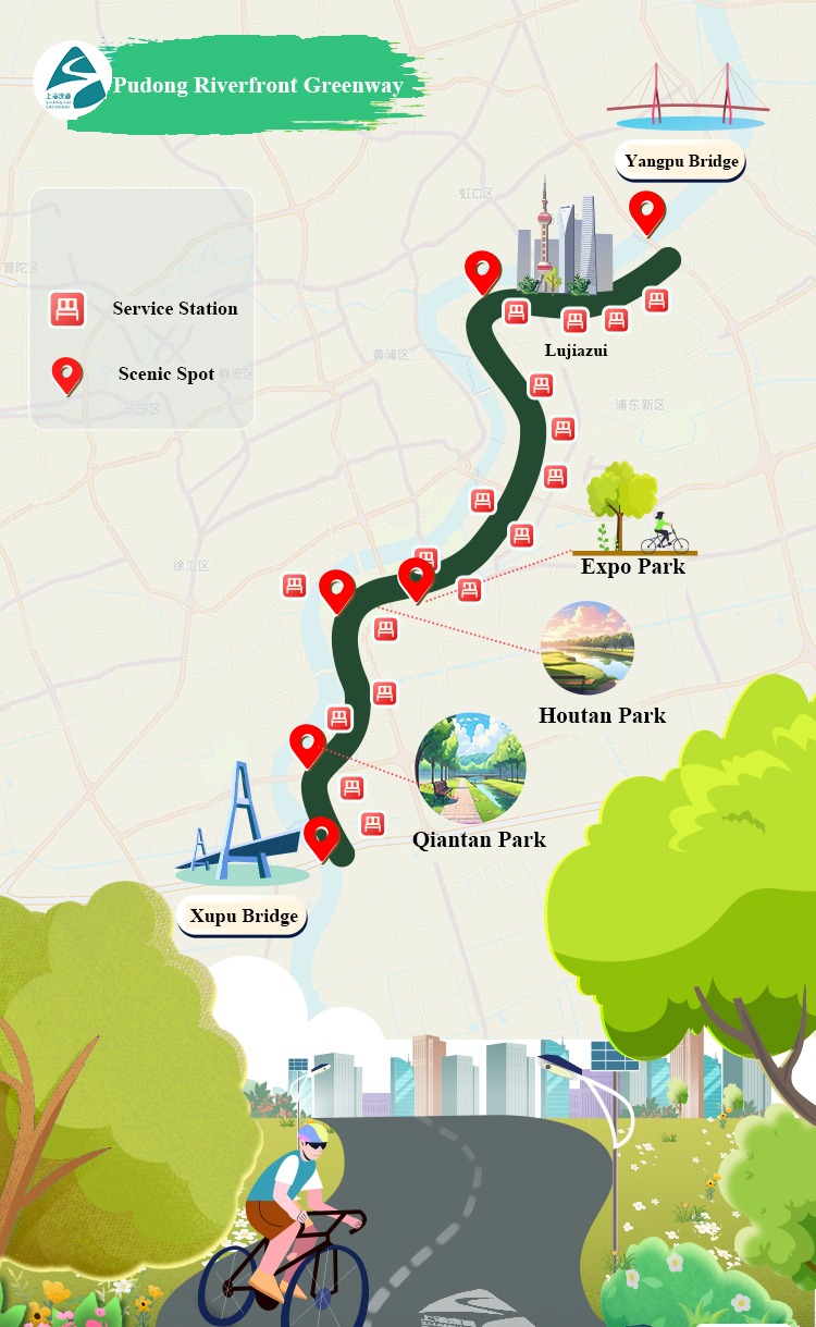 This greenway winds past some of the city's iconic attractions, including the Bund area with its historic architecture, the South Bund waterfront, and the Shanghai World Expo area. The continuous riverfront path enhances the landscape, blending greenery with inviting leisure routes.