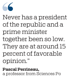 "Never has a president of the republic and a prime minister together been so low. They are at around 15 percent of favorable opinion," said Pascal Perrineau, a professor from Sciences Po, on French radio station RTL on Monday.