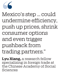 Lyu Xiang, a research fellow specializing in foreign trade at the Chinese Academy of Social Sciences in Beijing, said, "Mexico's step, instead of really protecting local industries, could undermine efficiency, push up prices, shrink consumer options and even trigger pushback from trading partners."