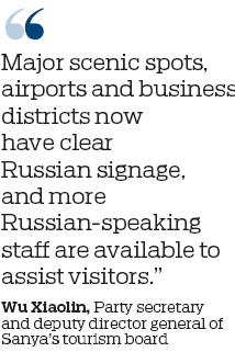 Wu Xiaolin, Party secretary and deputy director general of Sanya's tourism board, said, "Major scenic spots, airports and business districts now have clear Russian signage, and more Russian-speaking staff members are available to assist visitors."