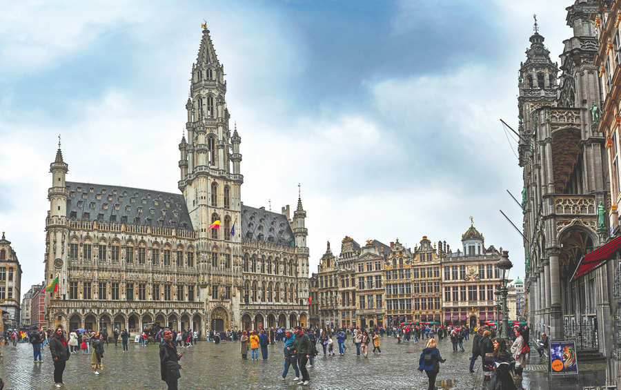 People walk through Brussels' Grand Place, where ornate guildhalls adorned with gold details provide the backdrop to historical figures. ZHANG WEIGUO/FOR CHINA DAILY