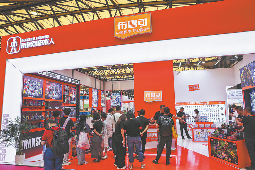 Visitors gather at Blokees' booth during the China Stationery Fair in Shanghai in June 2024. CHINA DAILY