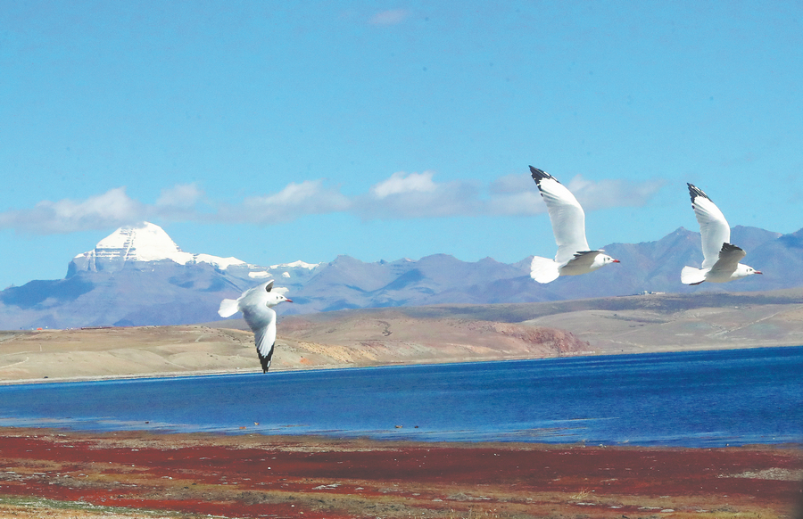 Three black-headed gulls hover above Mapam Yumco Lake in Ngari prefecture in the Xizang autonomous region. WANG JIANZHONG/FOR CHINA DAILY