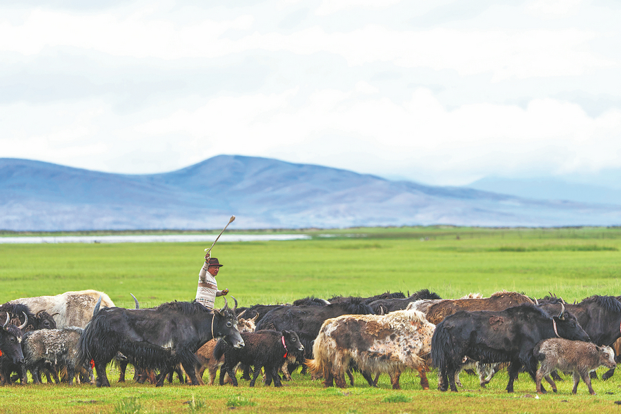 A Tibetan nomad herds yaks across the grassland around the lake. TENZIN NYIMA-CHUDRO/XINHUA