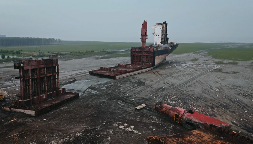 A decommissioned oil tanker lies against the muddy shore — like a beached whale being harvested for its body parts. The mise-en-scene lasts the full 10 minutes of the video film's length. It seems the camera, zooming in from above, is unable to avert its gaze, captivated by the terrible beauty of dismembered giant vessels sprawled out against a panoramic vista of land, water and sky.