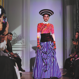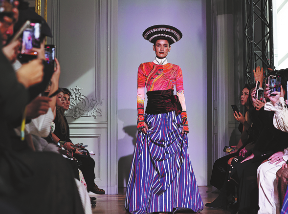 A model showcases clothing on Wednesday that blends the traditional craftsmanship of the Lisu ethnic group from China's Sichuan province with modern fashion elements, at the third Sino-French Fashion Week held at the China Cultural Center in Paris.