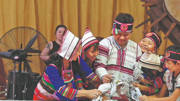 Children of the Jino ethnic group from Yunnan province rehearse for The Ocean Etched in the Forest. CHINA DAILY