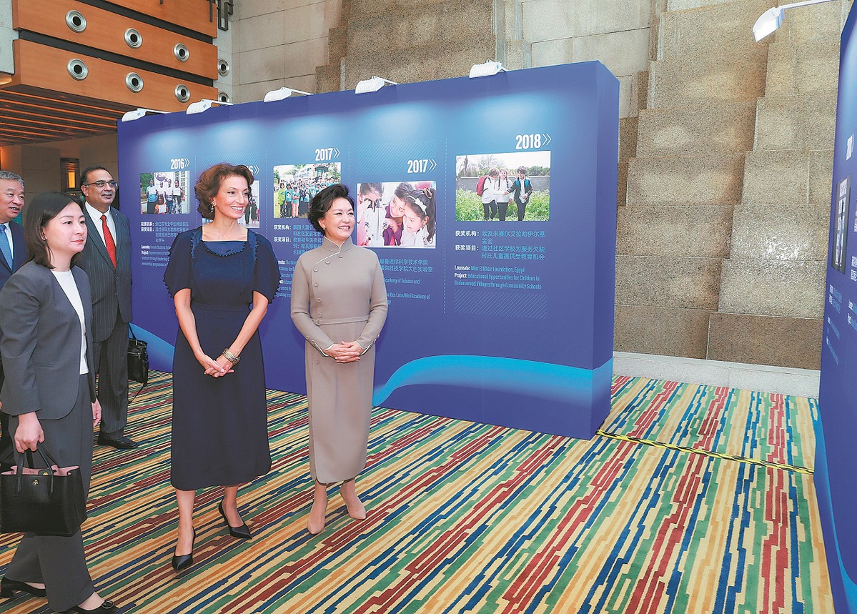 Peng Liyuan (right), wife of President Xi Jinping and a special envoy of the United Nations Educational, Scientific and Cultural Organization for the advancement of girls' and women's education, and Audrey Azoulay, director-general of UNESCO, visit a photo exhibition featuring the award-winning projects of the UNESCO Prize for Girls' and Women's Education in Beijing on Sept 19. Peng and Azoulay attended the award ceremony, which marked the 10th anniversary celebration of the UNESCO prize. DING LIN/XINHUA