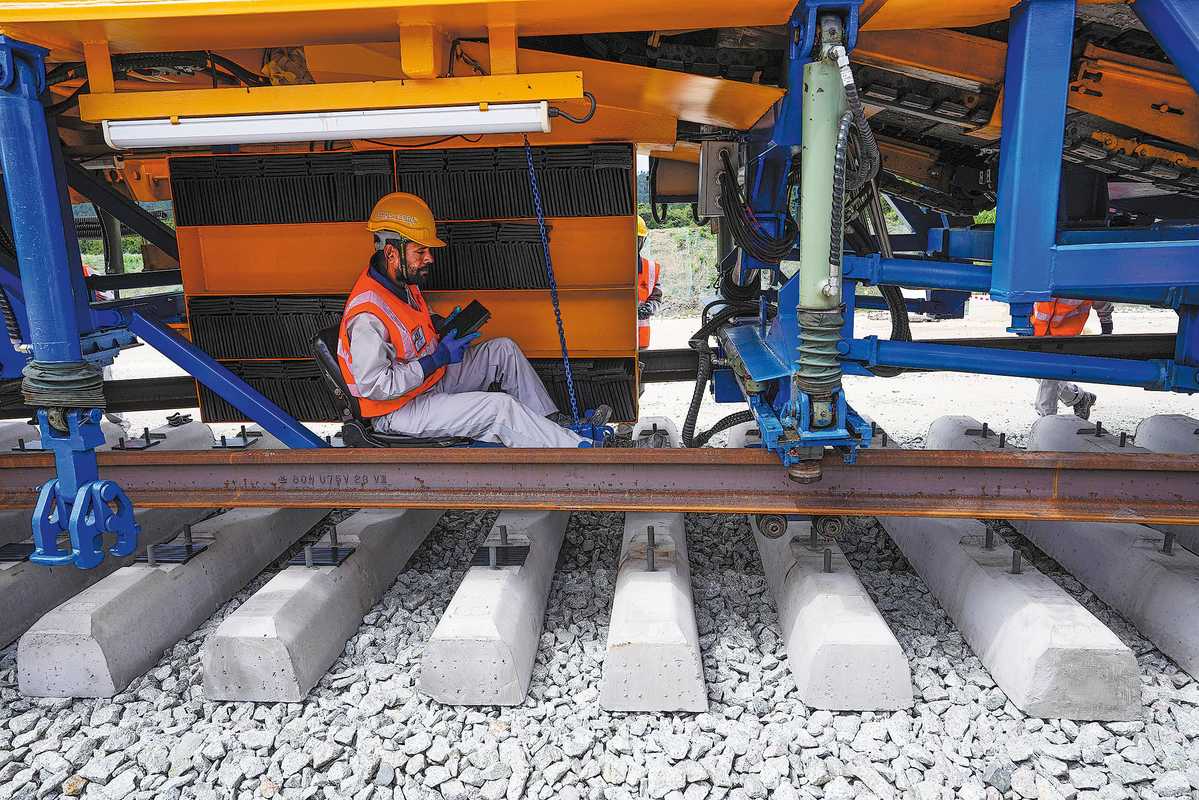 Workers install the first track for the East Coast Rail Link project in Pahang, Malaysia, on Dec 11, 2023. VINCENT THIAN/AP