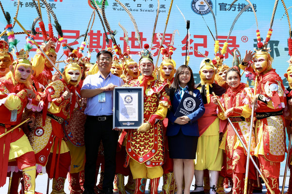 Following rigorous verification, a Guinness World Records official announced on site that the challenge for the "largest gathering of people dressed as the Monkey King" was successful and presented the certificate.