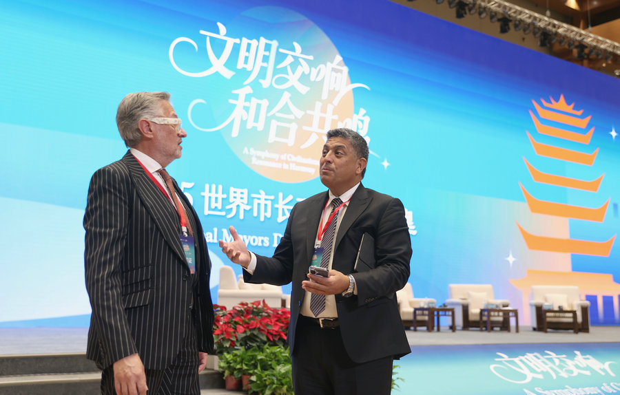Guests converse with one another following the main dialogue session of the "Global Mayors Dialogue · Dunhuang" in Dunhuang, Gansu province, Oct 13, 2025. [Photo by Chen Zebing/chinadaily.com.cn]