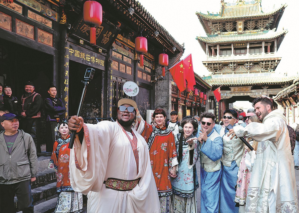 Foreign vloggers pose for photos at the Pingyao Ancient City in Jinzhong, Shanxi province, on Wednesday. The visit was part of the Discovering Shanxi's Ancient Chinese Architecture — Overseas Media and Students Tour, organized by China Daily and Shanxi Daily. ZHU XINGXIN/CHINA DAILY