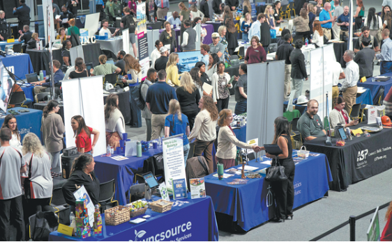 Recruiters speak to job seekers at the Appalachian State University internship and job fair in Boone, North Carolina, on Oct 1. ALLISON JOYCE VIA GETTY IMAGES