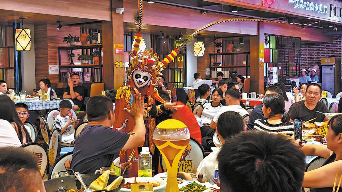 A performer interacts with diners during a "Crayfish King" face-changing show at a restaurant in Qianjiang, Hubei province, this summer. GUAN HONGLEI/FOR CHINA DAILY